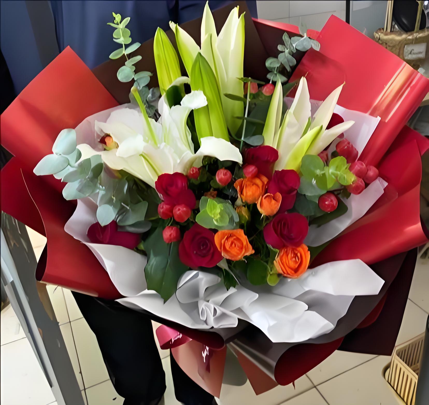 饶阳县花店包11枝红玫瑰、2枝多头白百合、6枝橙色多头玫瑰、红豆、尤加利叶